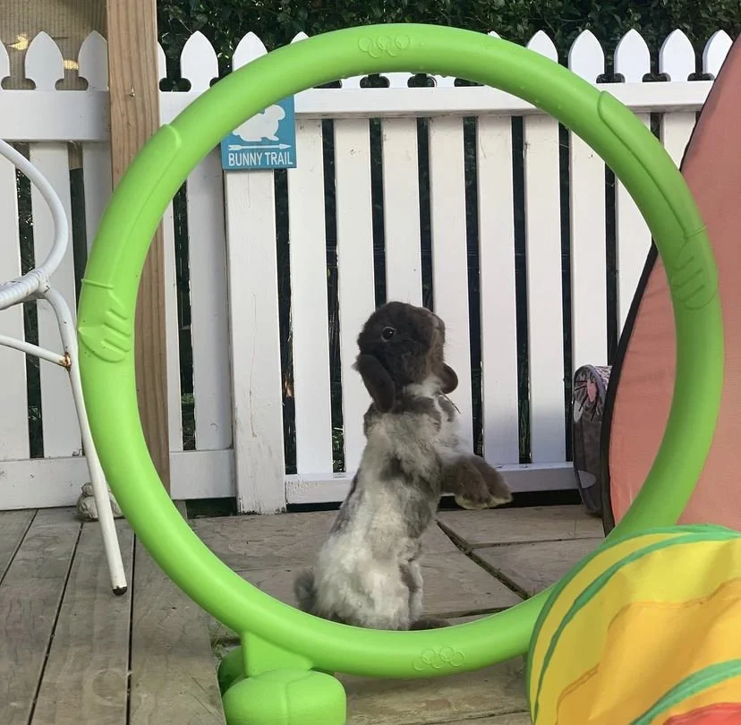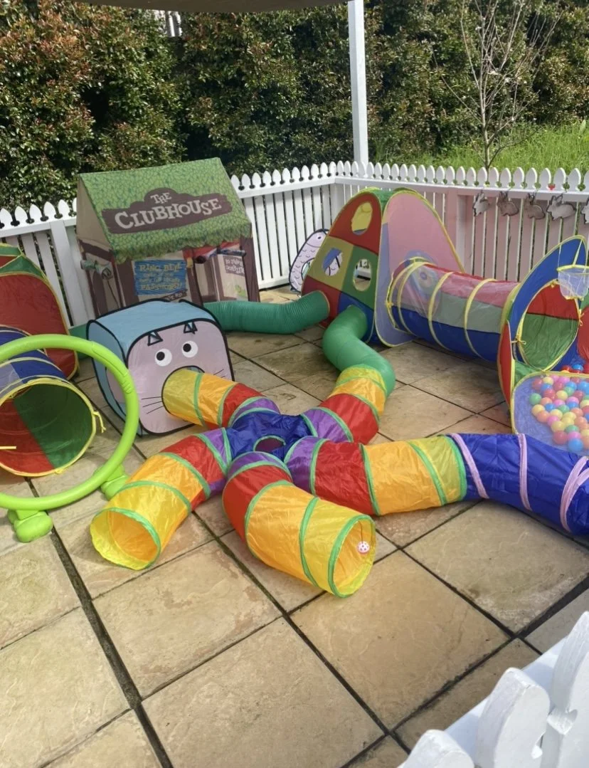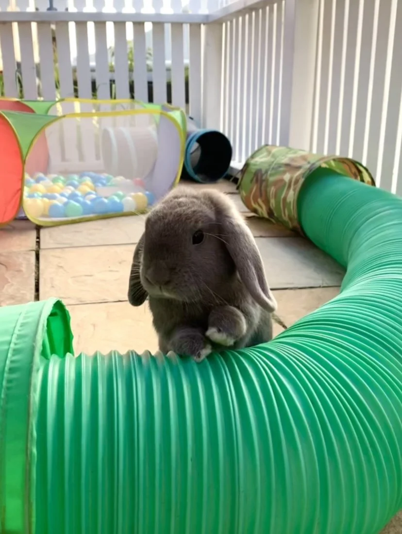 Features of The Bun Run include long tunnels, caves, toys, things to hope on and things to hop through! The ground is made from wet-cut paving which provides a hygienic, cool, and non-slip surface to allow for your bunny to run and exercise to their heart’s delight. We do not have grass or exposed ground in The Bun Run for the safety and health of your bunny. The Bun Run and everything in it is always sanitised and hosed after use.